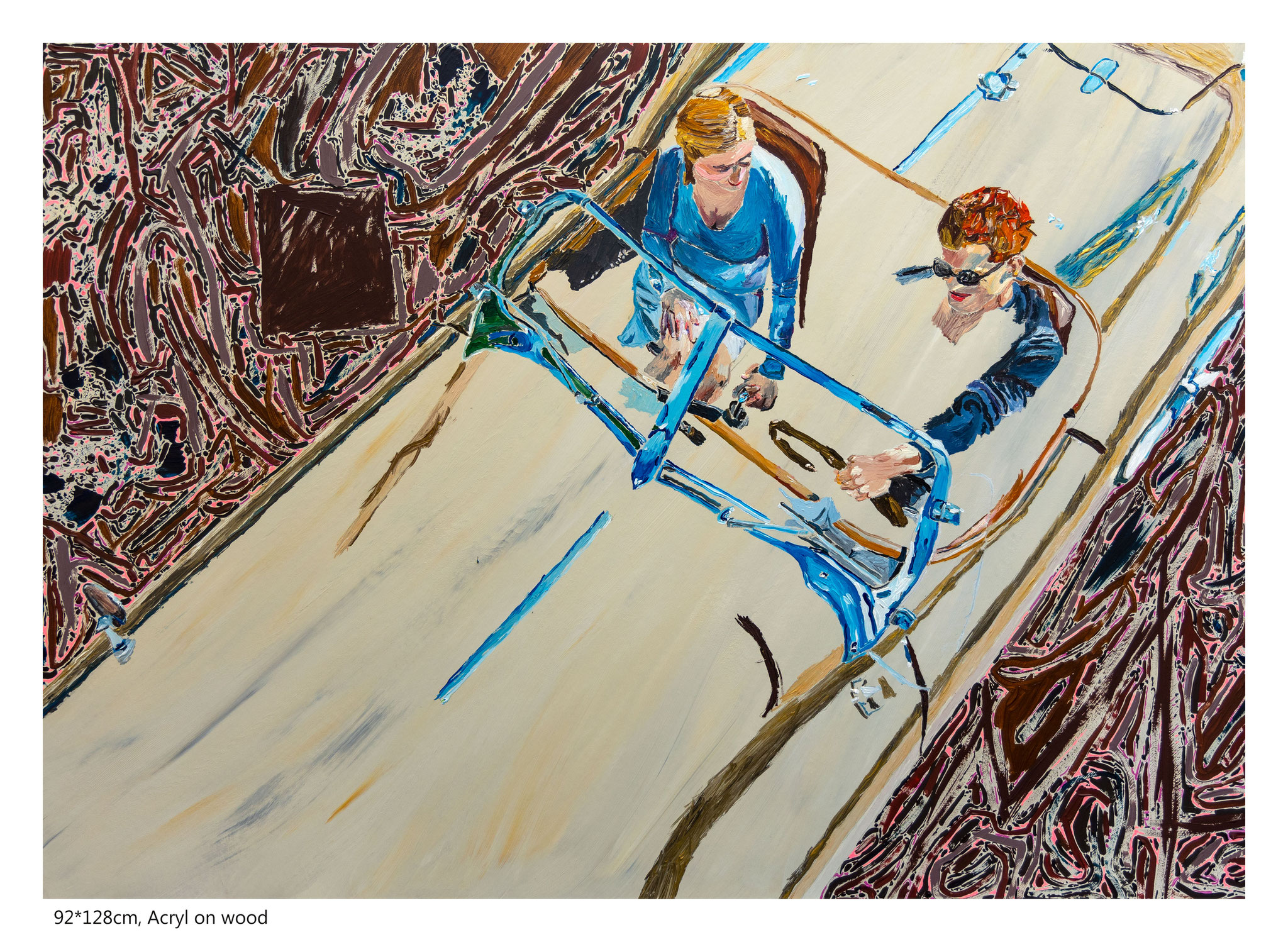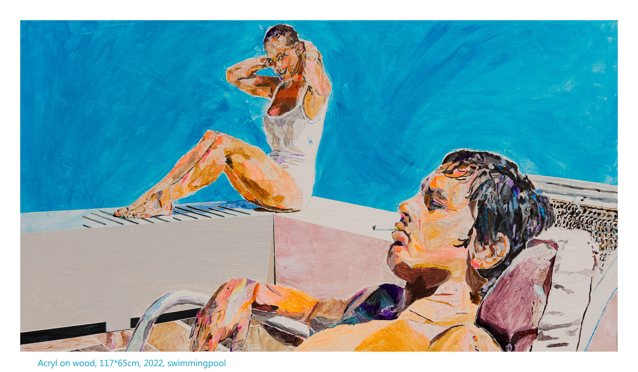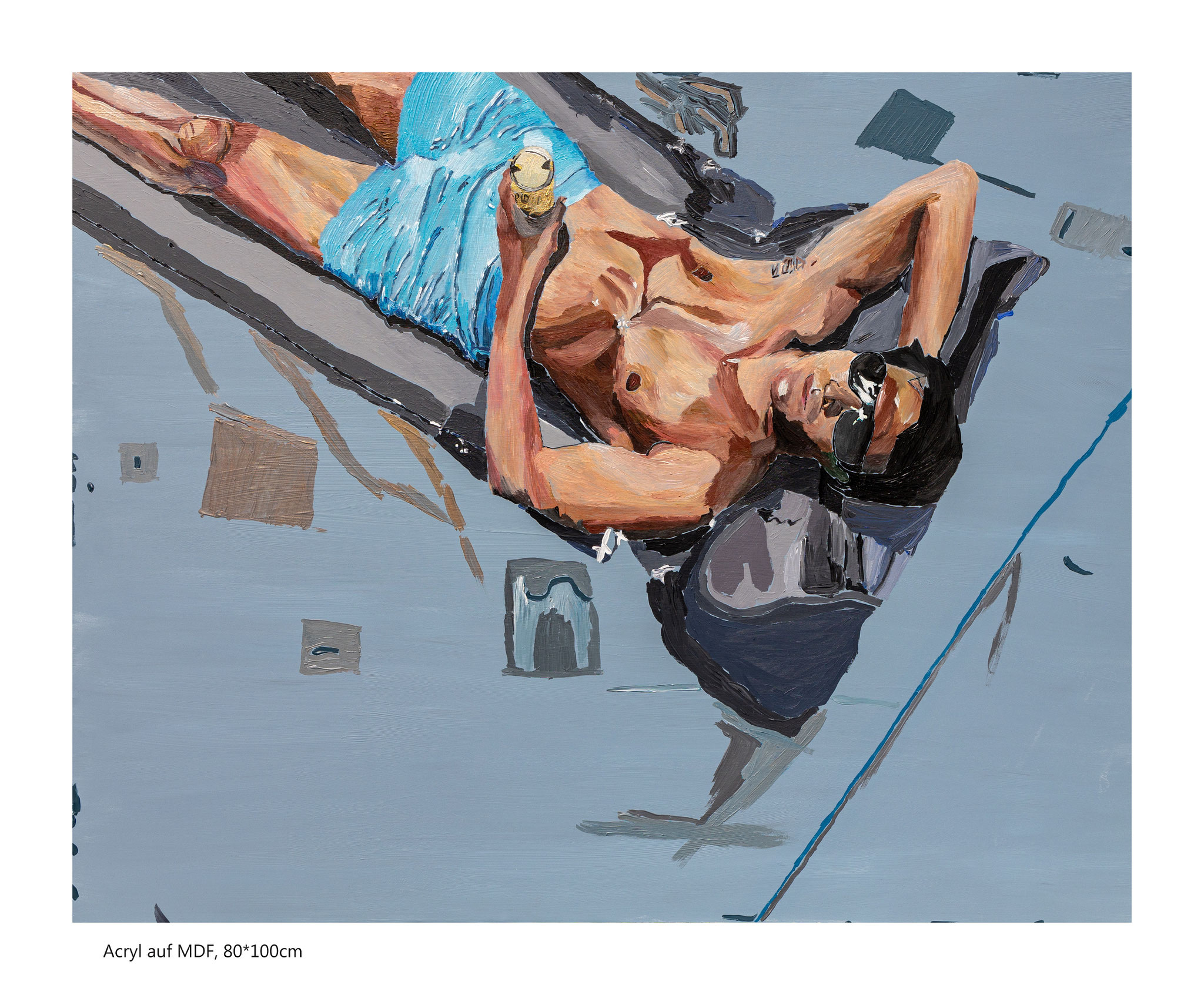 "For his paintings, Philipp Langer often works with photographs as sketches, from which he develops imaginative image worlds that evolve into his paintings. He also creates objects and sculptures that serve as staging elements for these photographs.